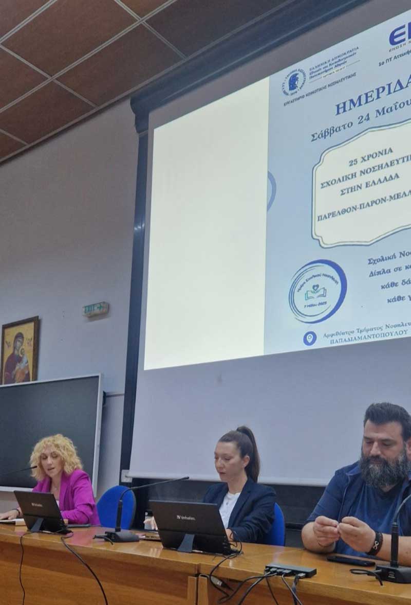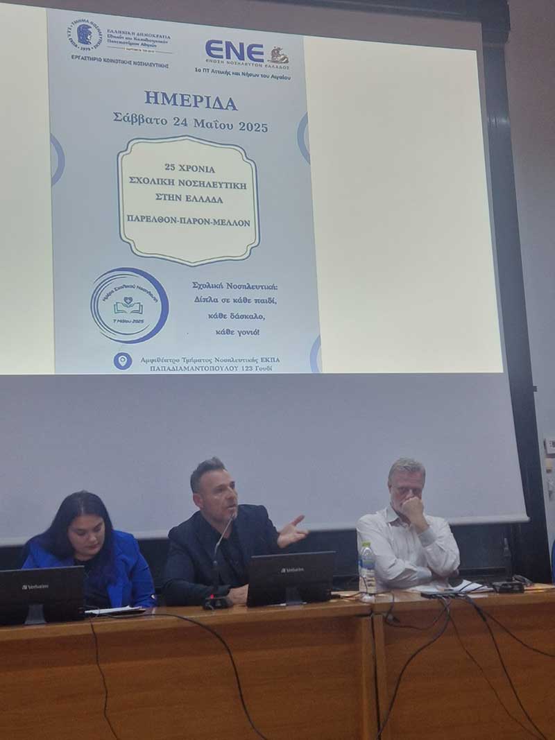 Το Σάββατο 24 Μαΐου 2025, στο Αμφιθέατρο του Τμήματος Νοσηλευτικής ΕΚΠΑ πραγματοποιήθηκε υβριδικά η Ημερίδα Σχολικής Νοσηλευτικής με θέμα: «25 Χρόνια Σχολική Νοσηλευτική στην Ελλάδα. Παρελθόν-Παρόν-Μέλλον», από το 1ο Περιφερειακό Τμήμα (ΠΤ) της Ένωσης Νοσηλευτών Ελλάδος (ΕΝΕ) σε συνεργασία με τη Μονάδα Σχολικής Νοσηλευτικής του Εργαστηρίου Κοινοτικής Νοσηλευτικής του ΕΚΠΑ και τον Επιστημονικό Τομέα Σχολικής Νοσηλευτικής της ΕΝΕ.
