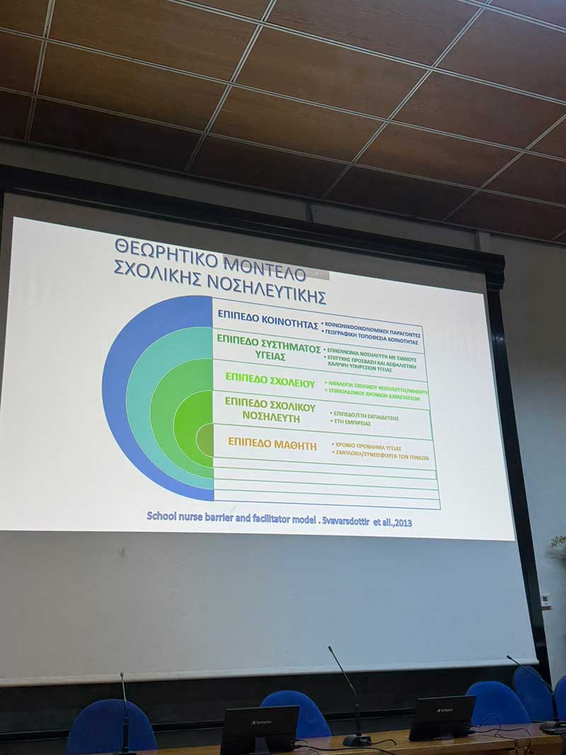 Τέλος υπογράμμισε την αναγκαιότητα να επαναπροσδιοριστεί η έννοια της νοσηλευτικής καριέρας, ενσωματώνοντας δυναμικά το ρόλο του σχολικού νοσηλευτή ως βασικό παράγοντα για την προαγωγή της υγείας και της ευημερίας των μαθητών.